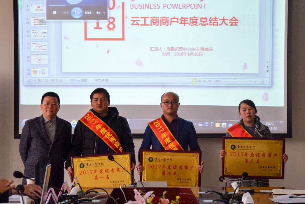 2017年,在全体商户的共同努力下,本着一切为师生服务的宗旨,学校后勤与商户围绕提升保障力度、优化服务两个方面,激流勇进,圆满完成了2017年的后勤工作任务,提高了学校的知名度,提升了师生的满意度。1月16日,云南工商学院常务副校长邹利斌、后勤运营中心主任黄翠芬及商户代表齐聚行政楼一楼会议室举行2018云工商商户年度总结大会。