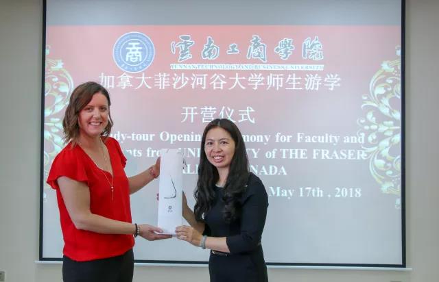 仪式由国际事务负责人陈琳主持,国际学院院长莫艳萍与加拿大菲莎河谷大学代表老师Kara Bertram分别介绍了各自学校的教学现状、教学模式、特色办学理念及情况;我校学生代表李文熙将自己在云南工商学院的大学生活比做一杯冰可乐,向加拿大师生们幽默地自我介绍并表示热烈欢迎。观看完我校宣传纪录片和“体验汉语、感受云南”游学计划表后,外方纷纷表示我校学生丰富的校园活动和接下来的游学安排令他们十分期待。