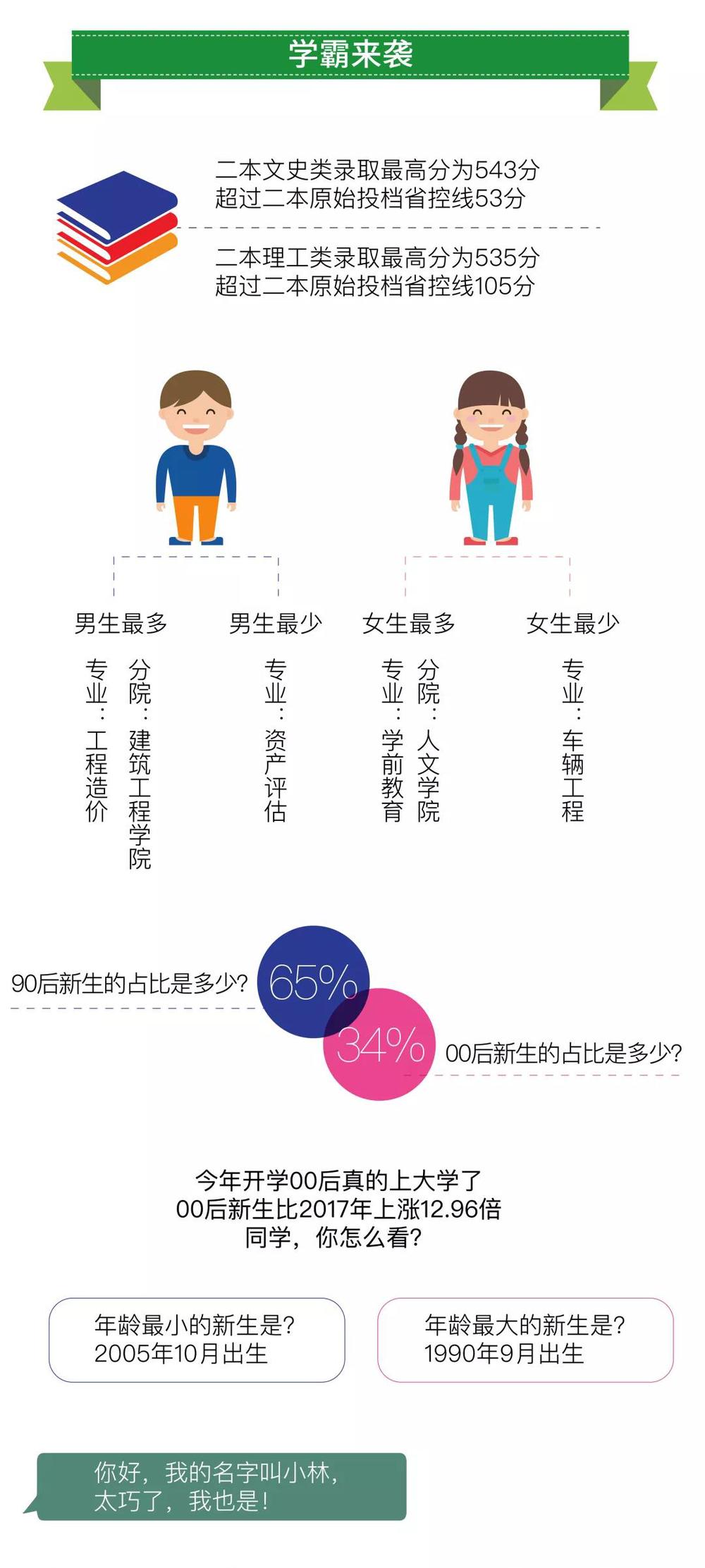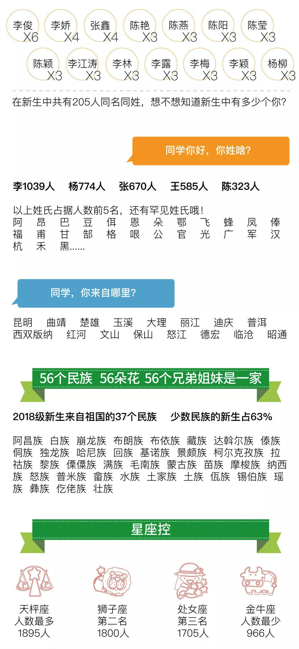 开学的脚步越来越近了,2018级萌新们,你是不是对你的大学怀有一点好奇与期待呢?要是整个专业只有1个女生;新生中6个人和你同名同姓;天秤座人数最多、金牛座人数最少;李、张、杨、王、陈的姓氏排前五名。这些数据是否有趣呢?先看看云工商《2018级新生大数据解析》。觉得好玩,记得转给好友哦!