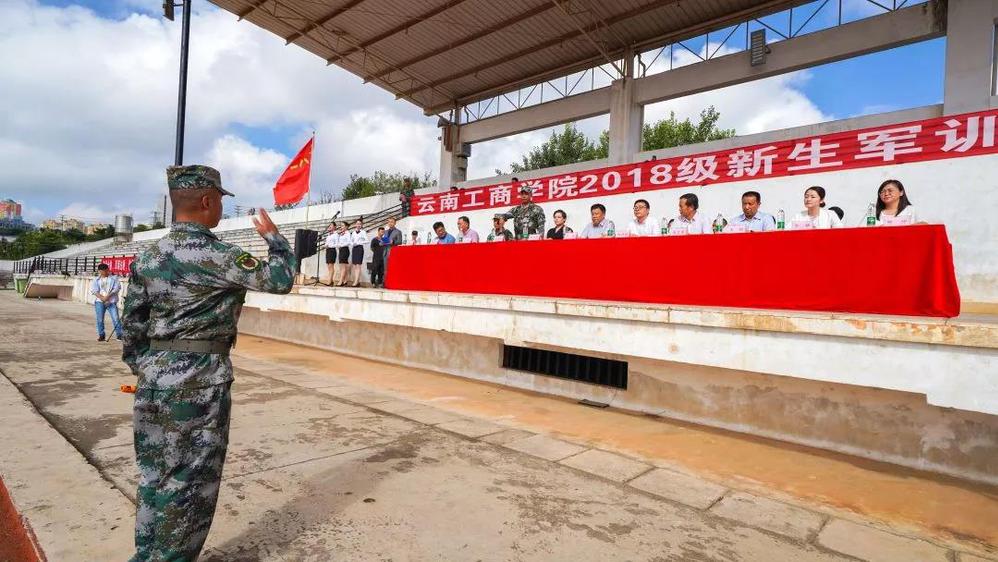9月4日,云南工商学院2018级新生军训动员大会在足球场举行,云南工商学院2018级新生军训团团长付忠和少校,副参谋长可开发上尉,云南工商学院党委书记于波同志、校长刘风明博士、常务副校长邹利斌副教授、副校长高卫国教授、副校长李翔教授、副校长李娅副教授、教务处处长张雪占副教授、学生处处长师帅同志及各二级学院院长出席大会。此次大会由张立春同志主持,由此开启了为期14天的新生军训序幕。