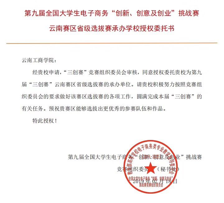 近期,我校收到第九届全国大学生电子商务“创新、创意及创业”挑战赛竞赛组织委员会(秘书处)批复,云南工商学院成为该赛事省赛承办单位。