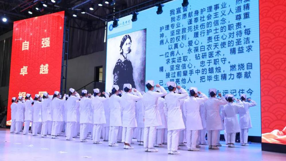 学生代表马文娟与所有同学举起右臂,庄严宣誓,朗朗的誓言,表达了学生们承担起护理工作者责任的决心。同时,高唱《护士之歌》,以优美的手势展示出护士的圣洁美丽。