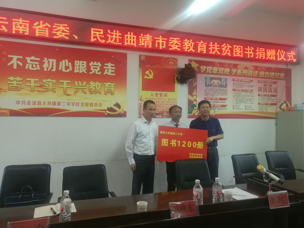27日下午,民进云南省委一行前往民进曲靖市委挂包帮联系点会泽县大井镇黄梨村进行了扶贫情况调研,并开展图书捐赠活动。图书捐赠仪式上,李孝轩介绍,中国民主促进会成员以从事教育、文化、出版工作的高、中级知识分子为主,具有政治联盟性质的政党与教育本来就有着与生俱来的紧密联系,民间又称民进为教师党,而在云南民进会员中就有68.7%是云南教育界的老师。他的职业身份也是一名教师,办学已经整整20年,因此,他对学校、对老师、对孩子,有着天然的、深厚的、发自内心的亲近感。这次的捐书活动,是民进省委和曲靖市委联合开展的教育帮扶项目,由新华书店直配向大井二中捐赠一批图书合计价值2.5万元。