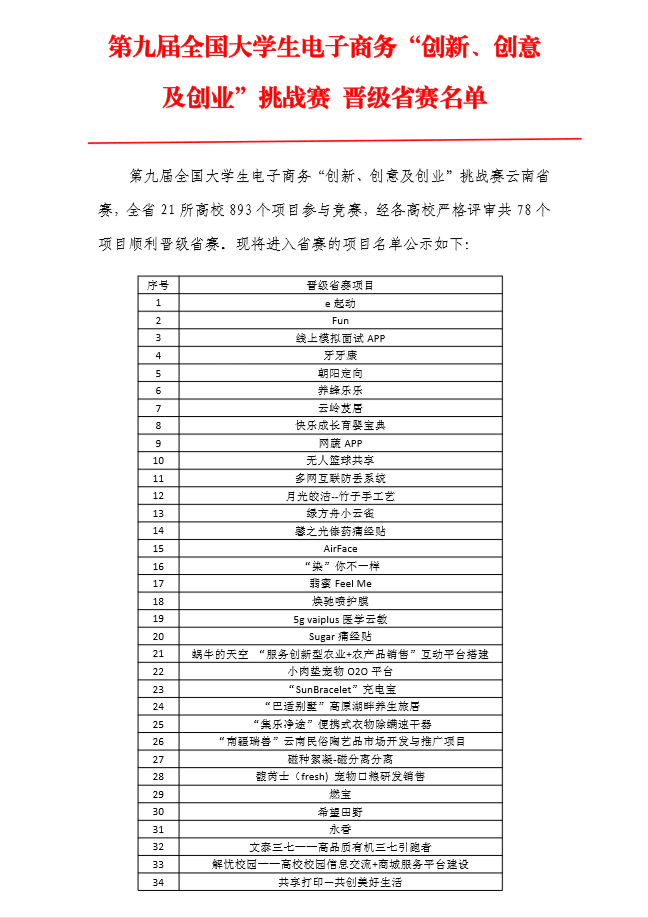 第九届全国大学生电子商务创新、创意 及创业挑战赛 晋级省赛名单