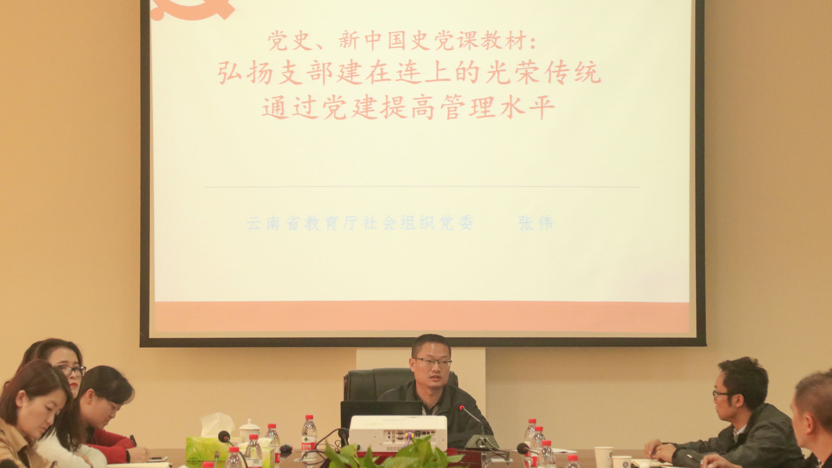 本次学习活动,邀请到中共云南省委高校工委、省教育厅“不忘初心、牢记使命”主题教育工作领导小组办公室第二指导组组长、省教育厅社会组织党委副书记、党建办主任张伟同志做专题辅导。他辅导的内容是党史、新中国史党课专题——弘扬支部建在连上的光荣传统通过党建提高管理水平。讲座进行的同时,第二指导组副组长、云南国土资源职业学院本科教育学院党总支书记吕晓莹同志,组员、云南财经职业学院宣传统战部副部长陈君奇同志,云南特殊教育职业学院科研处处长王丽萍同志分为两组对我校部分同志进行了深度访谈。