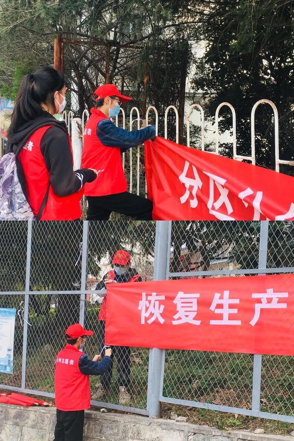 杨啸林和其他志愿者一起悬挂抗疫横幅和标语