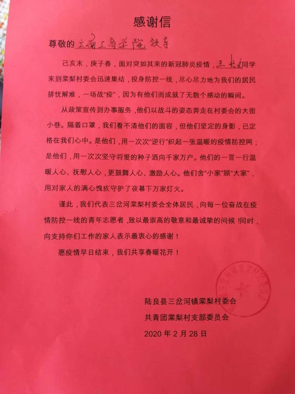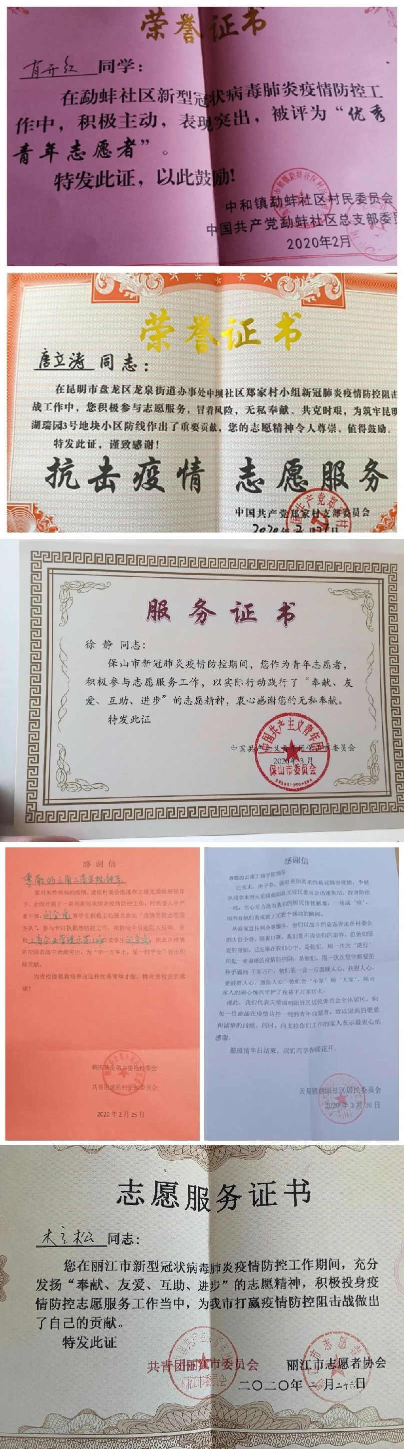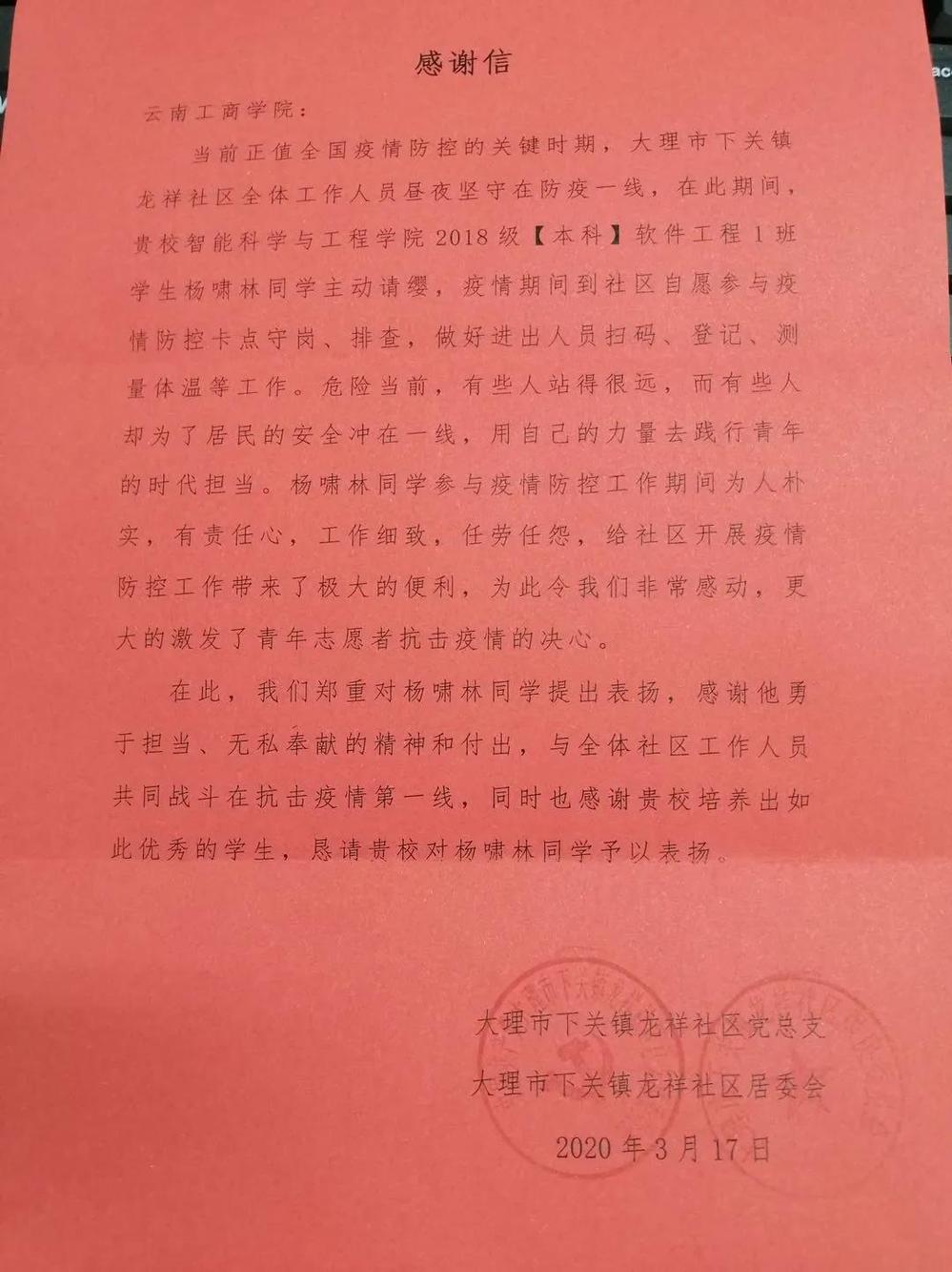 近日,学校收到了来自祖国各地的一封封感谢信,信中对在疫情期间积极参与疫情防控工作的云南工商学院学子表达了感谢,并给与了高度评价。