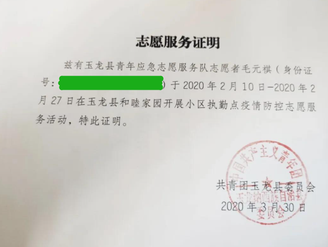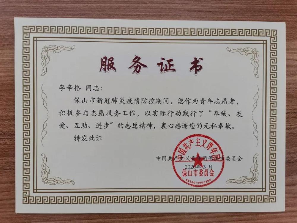 为执行国家关于疫情的防控工作,保山市在各社区组建了疫情防控小组,李辛格同学积极加入疫情防控青年志愿者义务开展新型冠状病毒防控工作,成为栗子园社区防控工作小组的一员。