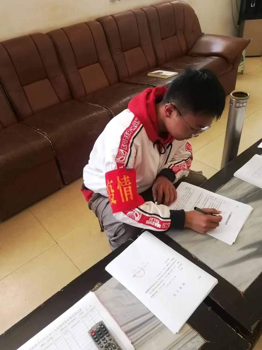 在疫情期间为了排查村民的体温情况,王怡文同学要去每家每户的测量体温,登记好每个人、每位村民的详细信息,为他们做好返岗前的准备工作,为他们解决后顾之忧。