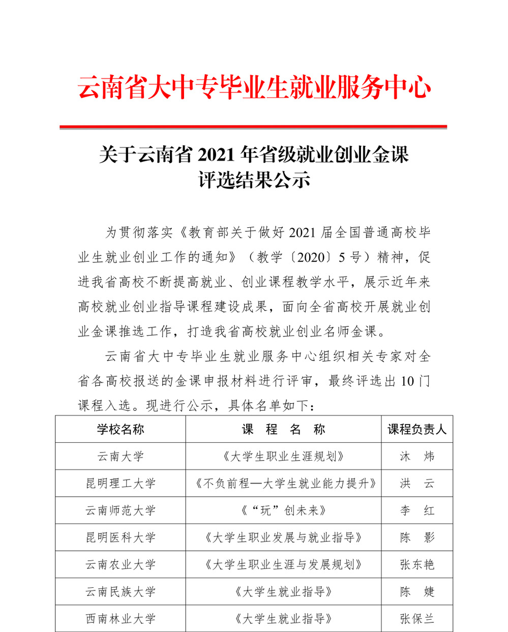 近日,云南省2021 年省级就业创业金课评选结果公示,全省共评选出10 门课程,云南工商学院勾英副教授《创新与创业》课程入选。