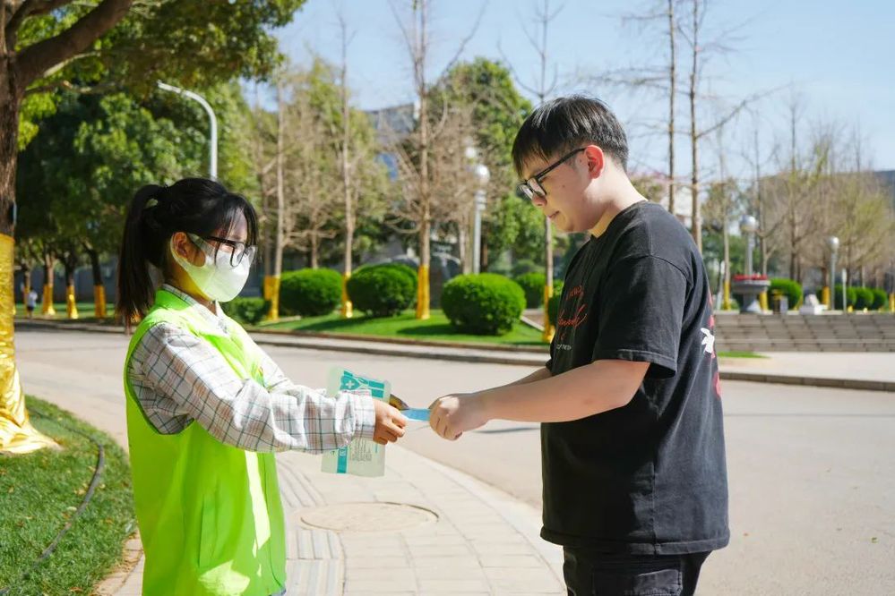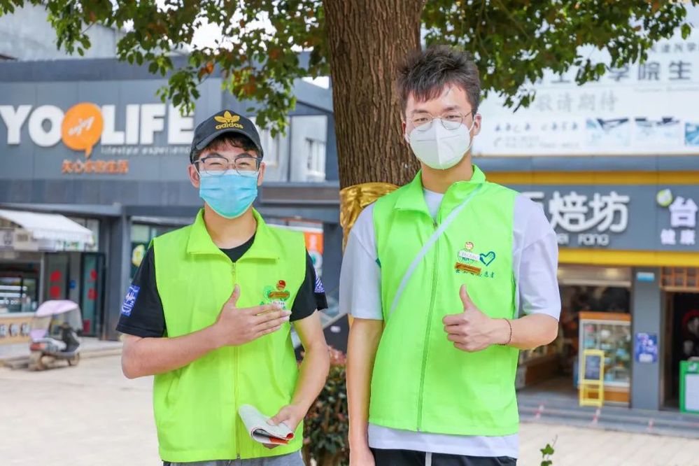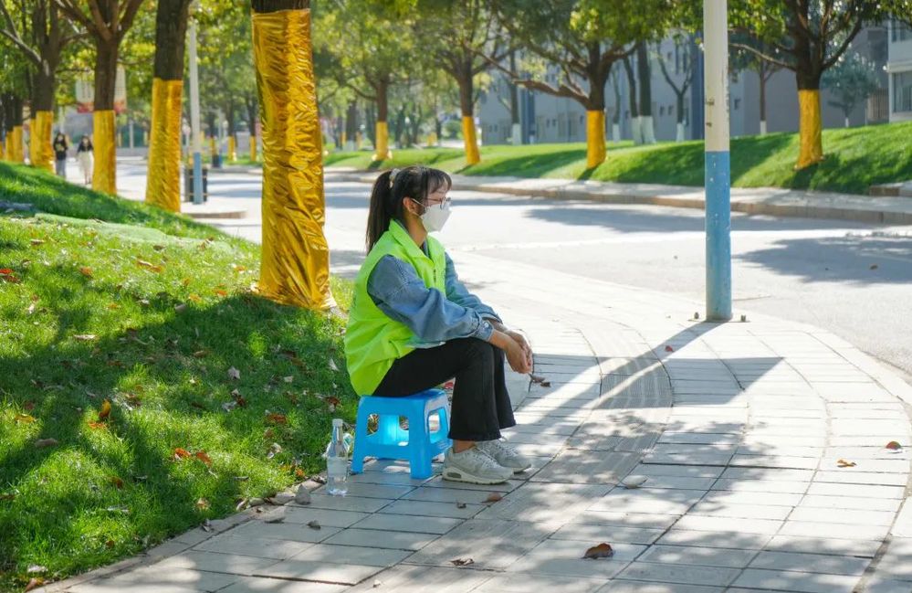 于是,校园里多了很多“不一样”的人。他们有的是穿着红色制服的党员、有的是荧光绿的志愿者,还有穿着橄榄绿的国防后备营,每个人都为了疫情防控贡献着自己的力量。