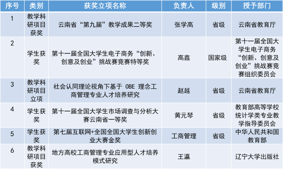 学院把教学放在突出位置,着力在提高教学质量上下功夫,应用型人才培养模式不断完善,教育教学质量明显提高。学院教师积极组织代表队参加全国各类竞赛,强化专业特点,增强学生实践应用能力。学院学生2020年获第十届正大杯全国大学生市场调查与分析大赛(本科组)国赛三等奖,(专科组)国赛一等奖、二等奖。连续两年获得大智慧全国金融精英挑战赛国赛一等奖和二等奖;连续三年蝉联省级市场营销大赛和电子商务大赛冠军;获得云南省“互联网+”大赛金奖和银奖;2019年获得全国大学生“三创”大赛特等奖、一等奖和二等奖;2020年获市场营销技能大赛省级一等奖,二等奖;电子商务技能大赛省级二等奖;第十届创新、创意、创业大赛省级特等奖、一等奖;“338”应用型人才培养模式获推国家级教学成果奖。