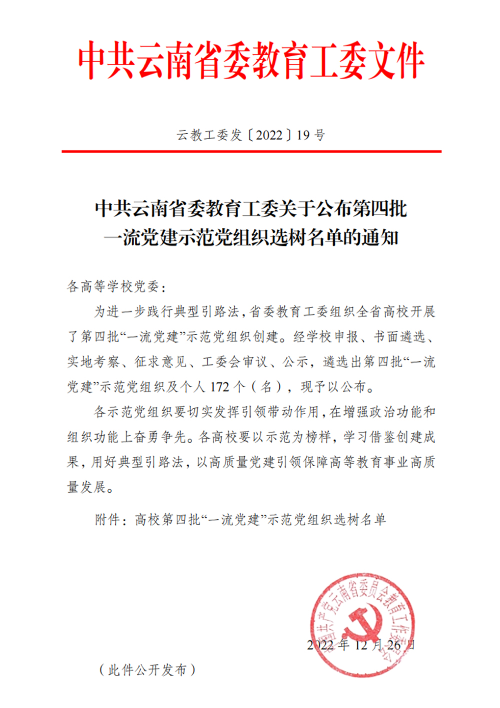 为进一步践行典型引路法,按照云南省创建高校一流党建工作安排,省委教育工委组织全省高校开展了第四批“一流党建”示范项目创建工作。经学校申报、书面遴选、实地考察、征求意见、工委会审议、公示,遴选出第四批 “一流党建”示范党组织及个人共172个(名)。