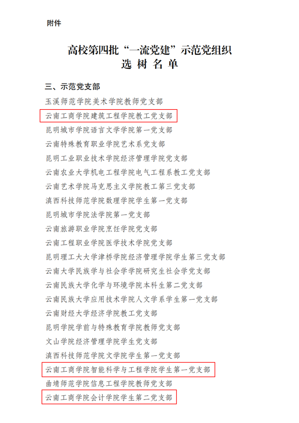 近日,中共云南省委教育工委印发了《中共云南省委教育工委关于公布第四批一流党建示范项目选树名单的通知》,云南工商学院建筑工程学院教工党支部、智能科学与工程学院学生第一党支部、会计学院学生第二党支部等3个党支部被省委教育工委选树为第四批一流党建示范党支部;马克思主义学院党支部书记勾英工作室被列为“双带头人”教师党支部书记工作室。