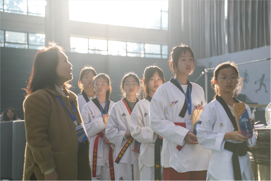 伴随着运动员代表和裁判员代表宣誓的结束,本次比赛正式启动。决赛共设置3个项目,包括校园跆拳道推广操比赛、品势比赛、竞技比赛。