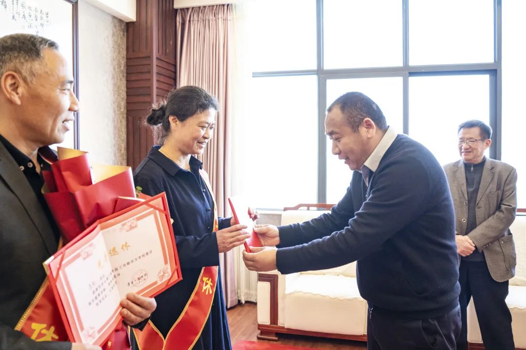 党委书记李国琼首先代表学校向三位教职工的光荣退休表示祝贺,并致以诚挚的敬意和感谢。她指出,三位老师淡泊名利、任劳任怨、无怨无悔地辛勤工作,伴随着学校的发展一路走来,见证了学校的奋斗历程。学校所取得的成就凝聚着每位教职工辛勤工作的点点滴滴,汇聚成了学校发展的强大力量,无论是公寓老师还是从事教学工作,都在自己的岗位上做出了努力和贡献。学校永远记得大家,感谢大家和学校风雨同舟,同向同行。