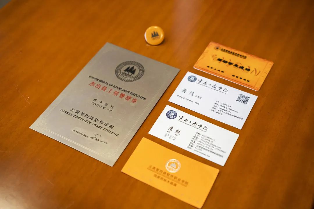 蒲甦老师讲述了他两次放下“铁饭碗”,毅然投身到云工商的教育事业,为学校的建设发展国内国外四处奔波。为了做好招生工作,云南129个县他走过110多个,作为一个四川人却已成为“云南通”。他拿出了珍藏多年的在建校之初使用的入职卡和他在2006年被学校评为“杰出员工荣誉奖章”的奖牌,让所有在场的领导和老师都惊羡不已,肃然起敬。