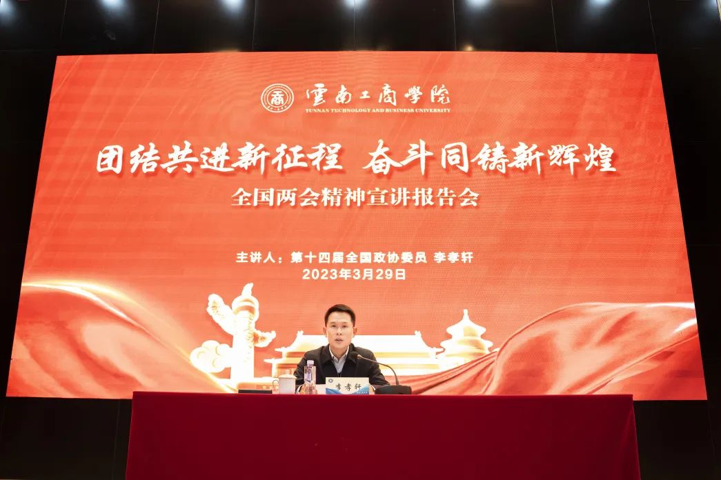 3月29日,参加全国两会归来的全国政协委员、云南工商学院执行校长李孝轩返校后,第一时间为师生们解读全国两会精神,分享参会的见闻和履职感受,把会上的好消息、好政策、好声音传递给师生,用行动书写责任与担当。