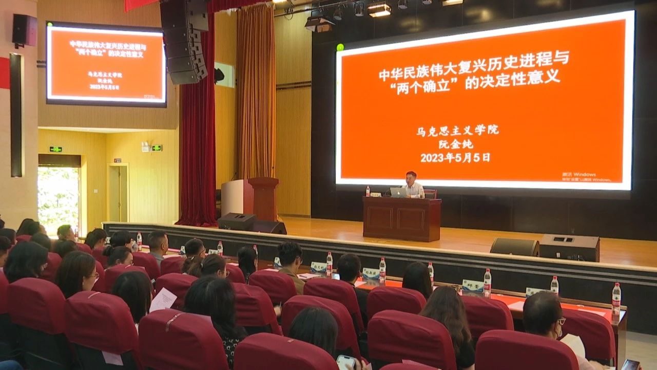 分课堂启动当天,云南工商学院邀请到全国高校思政课名师工作室主持人、云南省高校思政课教指委副主任委员、云南省委宣讲团成员、云南财经大学教授阮金纯做专题报告。阮教授以《中华民族伟大复兴历史进程与“两个确立”的决定性意义》为题,从实现中华民族伟大复兴是中国共产党百年奋斗的历史主题、实现中华民族伟大复兴进入了不可逆转的历史进程、以中国式现代化全面推进中华民族伟大复兴、“两个确立”对推进中华民族伟大复兴历史进程具有决定性意义等四个方面,进行了深入细致的宣讲。