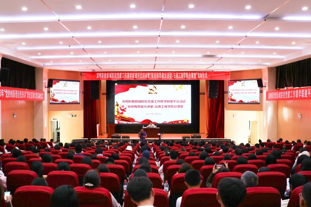 5月4日下午,学校举行的学习贯彻习近平新时代中国特色社会主义思想主题教育读书班开班式上,特邀中国人民大学马克思主义学院王向明教授以《习近平新时代中国特色社会主义思想概论》为主题作辅导报告;5月5日下午,在“张桂梅思政大讲堂-云南工商学院分课堂”暨嵩明职教新城院校党建工作联学联建平台学习活动中,特邀全国高校思政课名师工作室主持人、云南省高校思政课教指委副主任委员、云南省委宣讲团成员、云南财经大学阮金纯教授以《中华民族伟大复兴历史进程与“两个确立”的决定性意义》为题作专题辅导;5月5-6日晚,话剧——《桂梅老师》在学校体育馆上演;5月6日上午,嵩明县2023年度“党的创新理论我来讲”宣讲比赛暨“嵩明先锋讲师”“嵩理宣‘金话筒’理论宣讲员”选拔赛在学校举办。