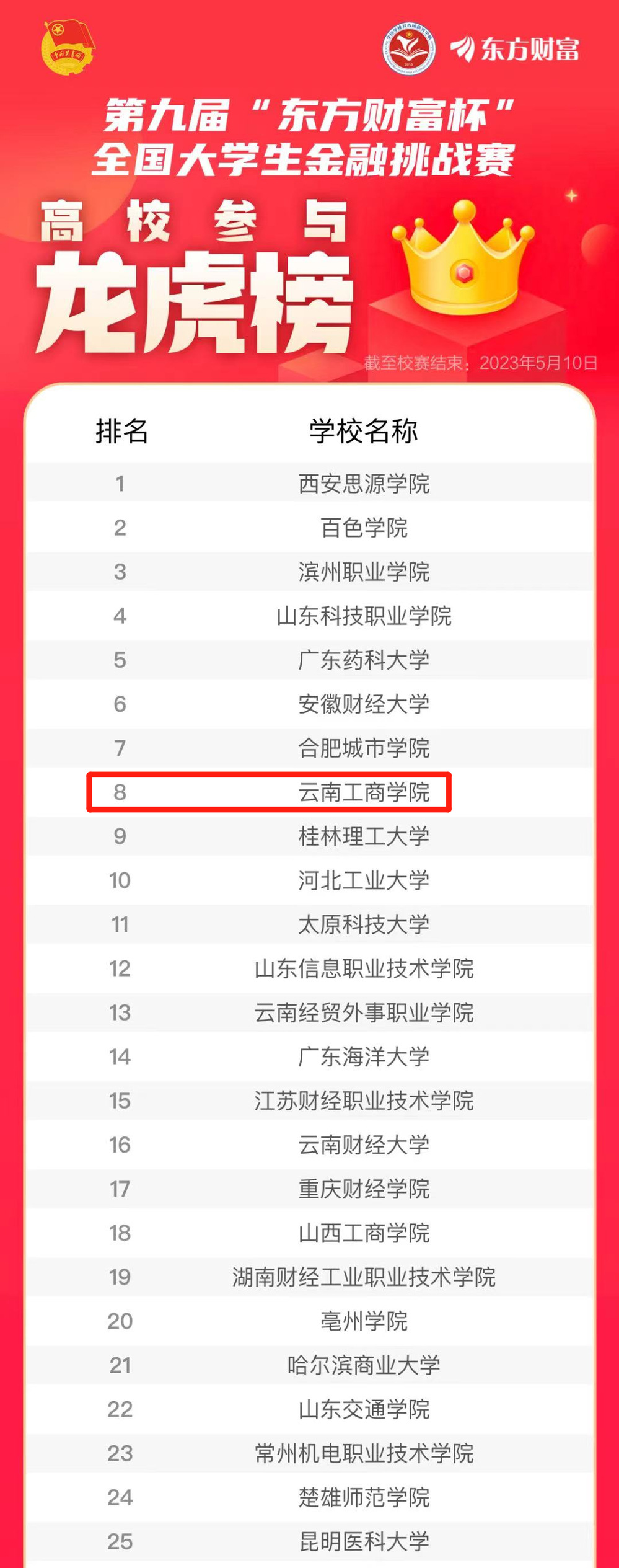 近日,由共青团中央青年发展部主办、全国学校共青团研究中心和东方财富信息股份有限公司承办的第九届“东方财富杯”全国大学生金融挑战赛校赛阶段正式落下帷幕。云南工商学院荣获参赛排名全省第一、全国第八!