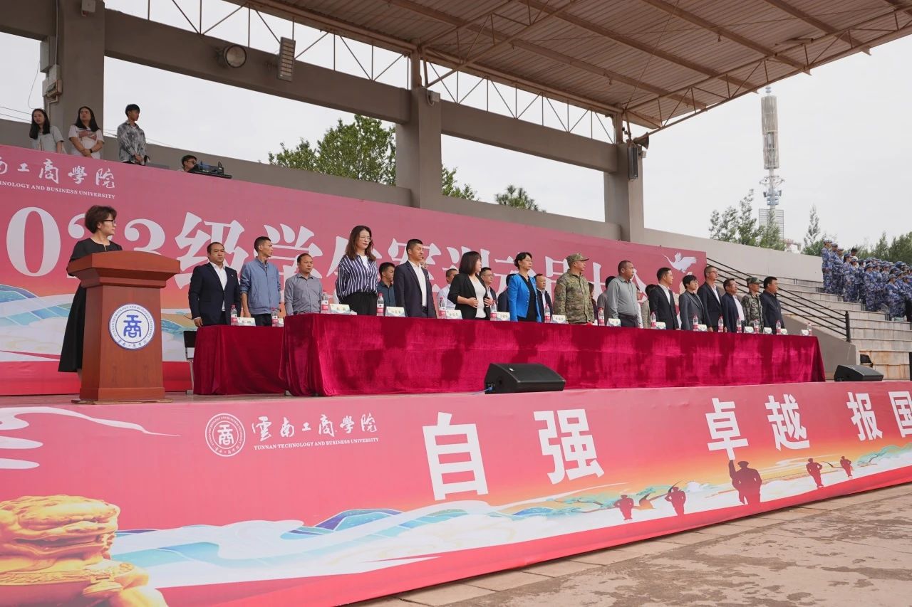 嵩明县委常委、人民武装部政治委员叶勇,嵩明县人民武装部派驻军训安全工作负责人曾钒,云南工商学院执行董事长姬其佐、党委书记李国琼、校长周刚等校领导,各二级学院院长、党总支书记,2023级学生全体辅导员等出席此次大会。