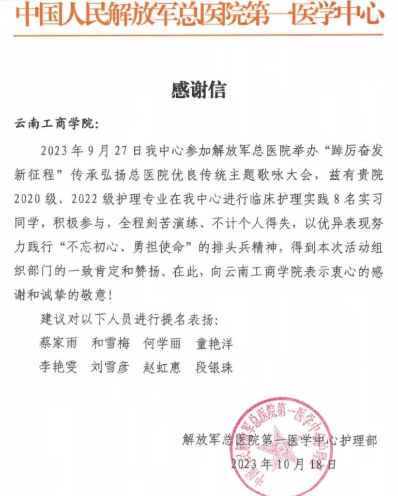 近日,云南工商学院收到了一封特殊的来信。这封信来自中国人民解放军总医院(北京301医院),提名表扬了我校在这里实习的8名同学。