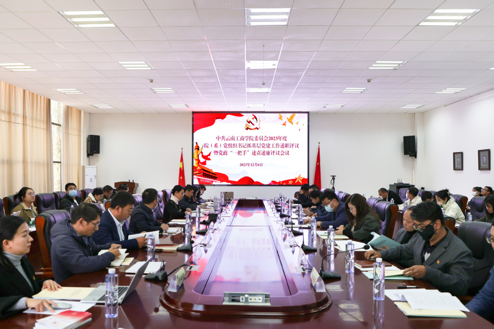 为深入学习贯彻习近平新时代中国特色社会主义思想,全面贯彻落实党的二十大精神,按照省委组织部关于党组织书记抓基层党建工作述职评议考核和省纪委关于党风廉政建设责任制检查考核相关要求,以及省委教育工委和学校党委统一安排部署,12月6日,云南工商学院召开2023年度院(系)党组织书记抓基层党建工作述职评议考核暨党政“一把手”述责述廉评议会。学校党委班子成员,党委七部一室负责人,各院(系)党总支书记、专职副书记、专职组织员,以及党支部书记代表、师生党员和群众代表等参加会议。会议由党委书记李国琼主持。