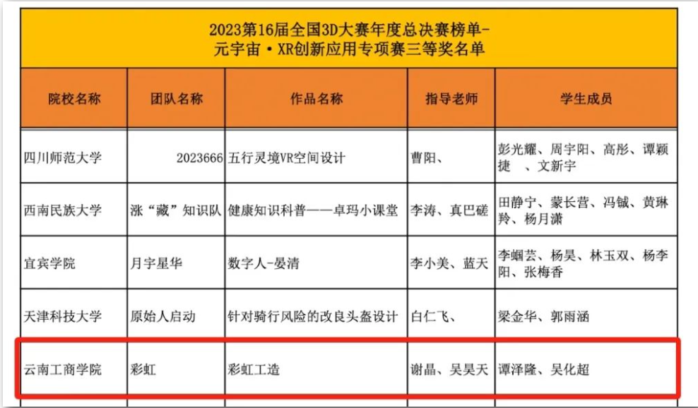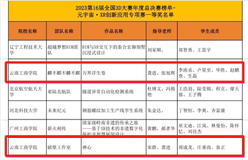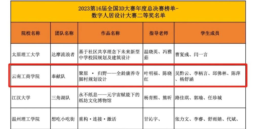 近日,2023第16届全国三维数字化创新设计大赛公布了年度总决赛榜单,云南工商学院建筑与设计学院参赛师生获得国赛一等奖2项、二等奖1项、三等奖1项。