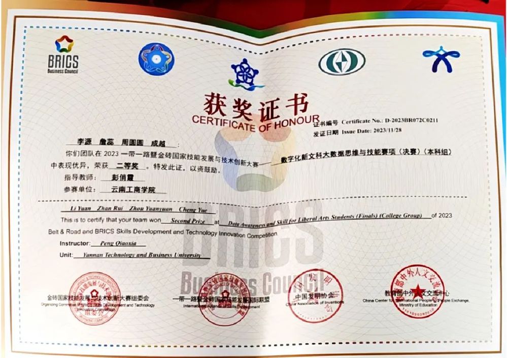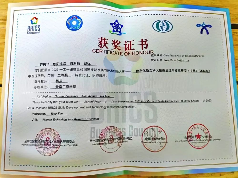 近日,云南工商学院经济与管理学院师生在2023第七届一带一路暨金砖国家技能发展与技术创新大赛——数字化新文科大数据思维与技能竞赛国内总决赛中斩获多个奖项,其中,学生组本科赛道获得国赛二等奖2项,教师组获得国赛二等奖1项、优秀奖1项。