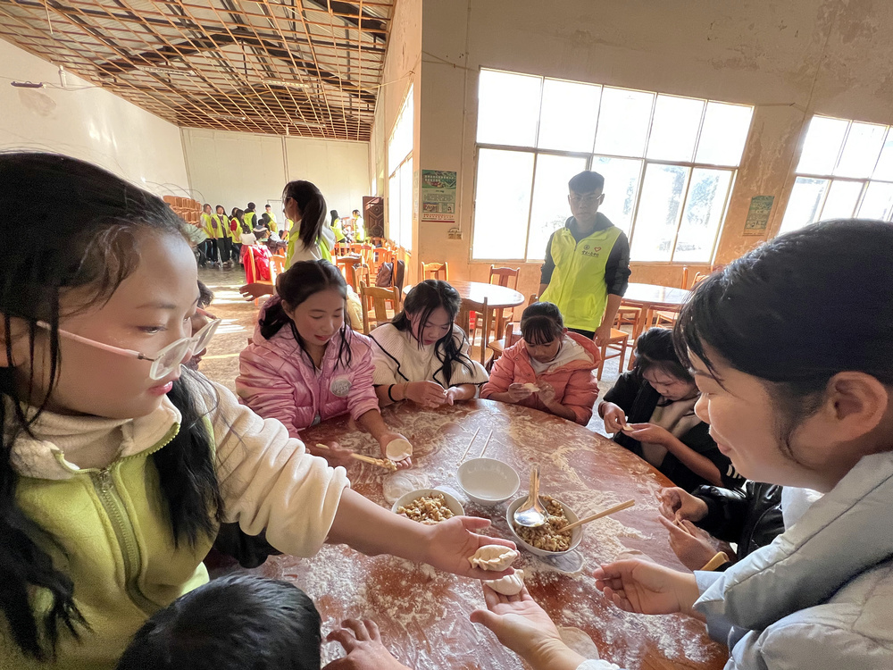 云南工商学院教师和大学生志愿者负责把馅配好、剁细,擀饺子皮,孩子们负责包。一只手拿起饺子皮,另一只手用筷子把馅儿挑起来放在饺子皮上,再把饺子皮从中间合起来,一个饺子便做成了。看着包出来的饺子,李紫羽笑了笑说:“饺子很好吃,但要包好可不容易。”