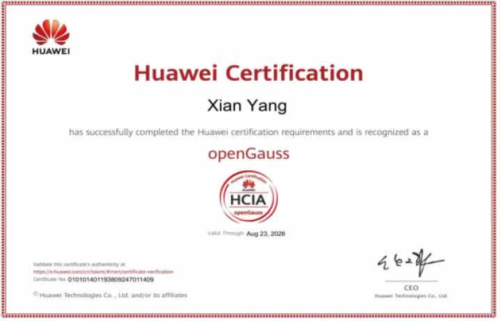 2023年,杨娴作为云南工商学院智能科学与工程学院专业教师,参加了openGauss数据库培训,在华为资深老师的带领下,初次接触了openGauss,并在培训中不断深入学习和实践,通过课程测试,获得openGauss的HCIA证书。