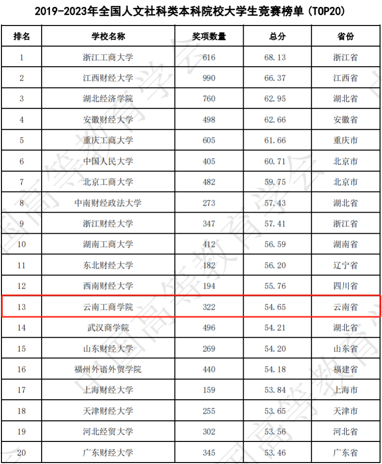 近日,中国高等教育学会高校竞赛评估与管理体系研究专家工作组发布《2023全国普通高校大学生竞赛分析报告》,报告显示,2019—2023年,云南工商学院累计获奖322项,位列2019—2023年全国大学生竞赛榜单(TOP20)第9名,位列2019—2023年全国人文社科类本科院校大学生竞赛榜单(TOP20)第13名。