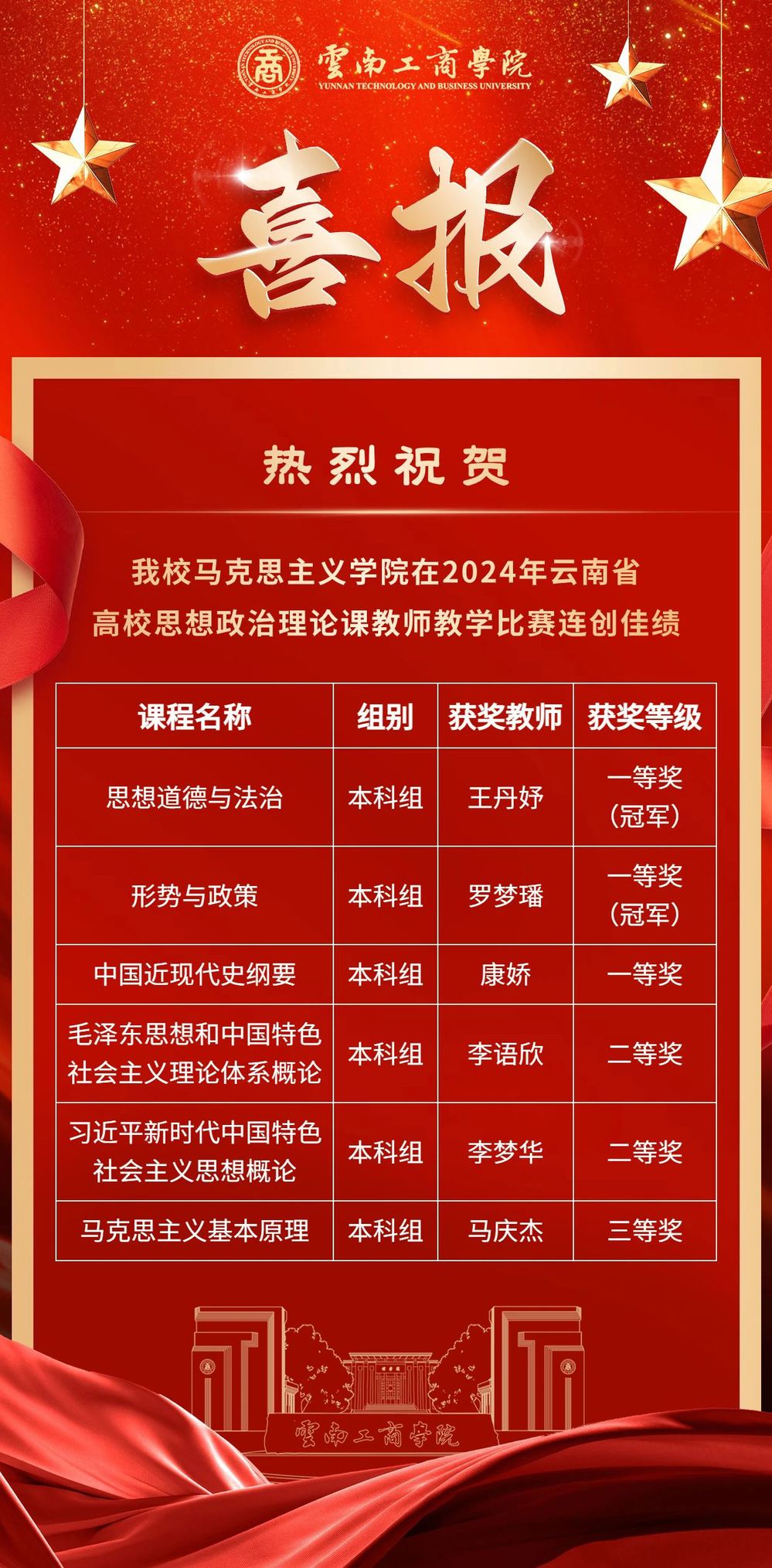 本次赛事自3月份启动以来,云南工商学院党政领导班子高度重视、精心组织、统筹谋划,组建了备赛专家指导团队,从教案、课件、现场讲课等多方面为参赛选手进行多轮次指导与打磨,通过“以赛促教、以赛促学、以赛促研、以赛促训”不断提升教师教育教学能力,不断增强思政课的思想性、理论性和亲和力、针对性。经过一个月余的激烈角逐,最终取得了可喜的成绩,在同类院校中拔得头筹。