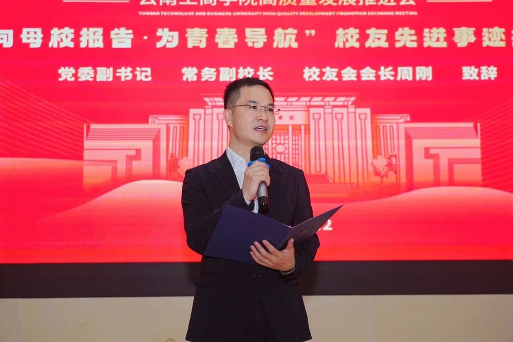 周刚开场致辞,云南工商学院在艰苦创业中成长、在励精图治中壮大,学校积极适应高等教育和地方经济社会发展需求,努力调整专业结构,创新人才培养模式,加强校地合作、推进产教融合,办学实力持续增强,人才培养质量不断提高,毕业生去向落实率连年攀升,品牌影响力不断扩大。他表示,希望各位校友能一如既往地支持和关心学校,为学校的事业发展建言献策、添砖加瓦、贡献力量。学校亦会把大家的意见当作改进工作的强大动力,创造有利机会,凝聚力量支持广大校友的事业发展。