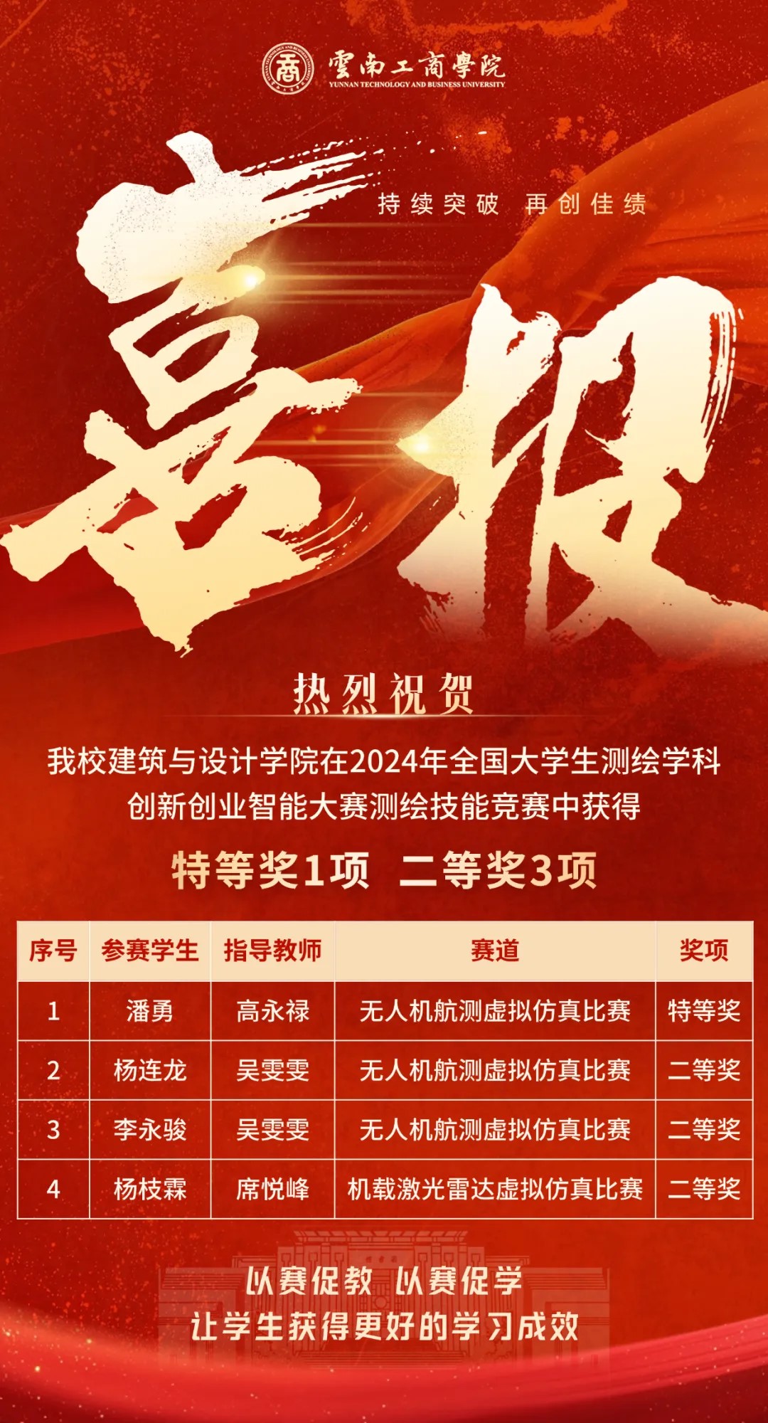 云南工商学院高度重视学生创新能力的培养,始终秉承“以赛促教,以赛促改,以赛促学”的理念,鼓励学生积极参与各类学科竞赛,通过实战演练来检验学习成果,提升实践能力和创新思维。下一步,学校将以此次比赛为契机,深入探索测绘学科的新领域、新技术,为测绘学科的创新发展贡献力量。