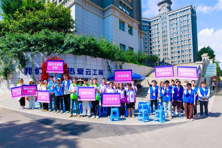 校园沐浴在热烈浪漫的粉蓝色迎新氛围中。道旗帜上的考研上岸榜样、优秀学子、优秀教师榜样等激励新生与良师益友同行。各类洋溢着青春气息的展板、条幅、玫瑰花瀑布、打卡点等吸引了同学们的目光,大家纷纷拍照留念。同时,迎新日全天还有社团才艺展示、云南特色“打跳”等活动,让新生们感受到了校园文化的无限可能。