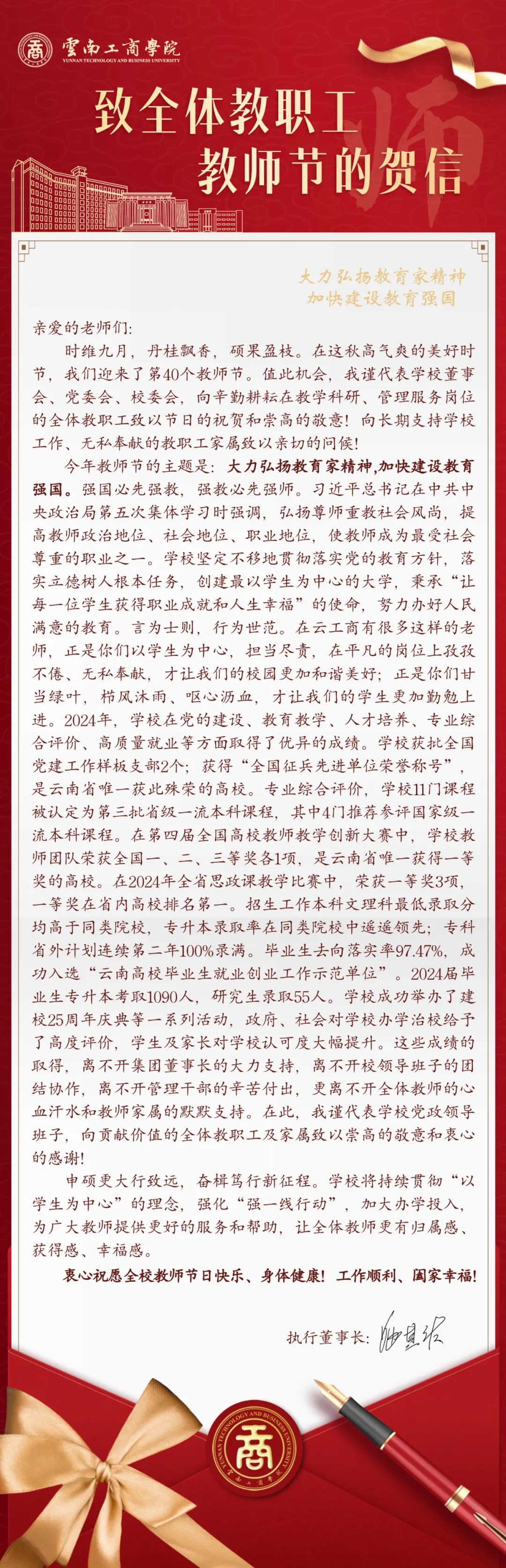 教育是国之大计,25年来,无数教育工作者在云南工商学院秉承“自强、卓越、报国”的精神,为党与人,为国育才,立足支点,点燃心灯。学校特别制作了庆祝第40个教师节特别献礼视频,祝所有教育工作者教师节快乐!