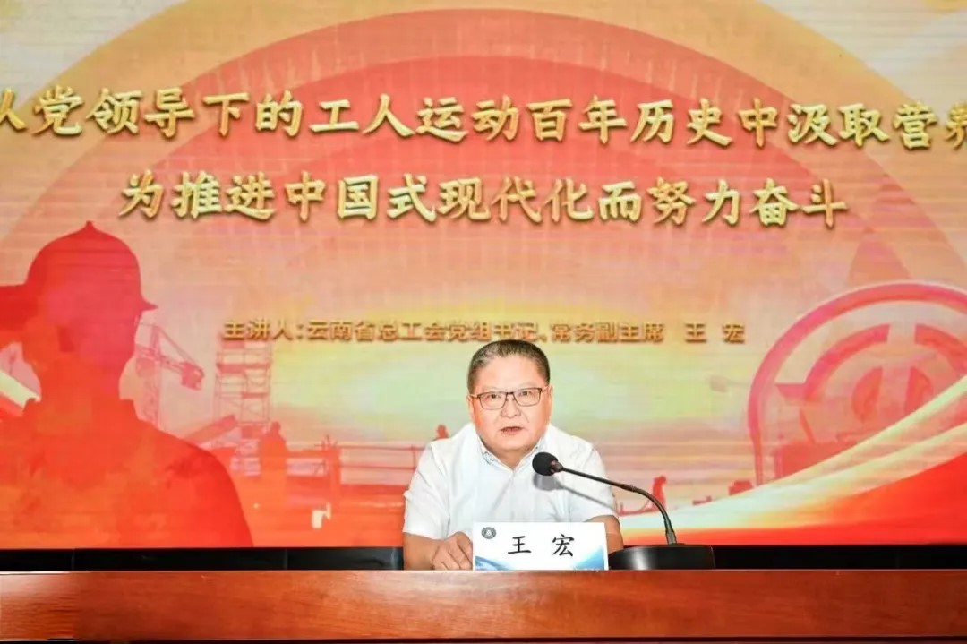 为深入学习贯彻党的二十届三中全会精神,大力弘扬劳模精神、劳动精神、工匠精神,发挥好劳模工匠示范引领作用。9月23日,由云南省总工会主办,云南工商学院承办的2024年云南省高校百场形势政策报告会——云南工运史专场正式召开,云南省总工会党组书记、常务副主席王宏来校开展主题为“从党领导下的工人运动百年历史中汲取营养、为强国建设民族复兴的伟业不懈奋斗”专题讲座。学校校委会成员、工会成员及师生代表参加讲座,讲座由校长蒋永文主持。