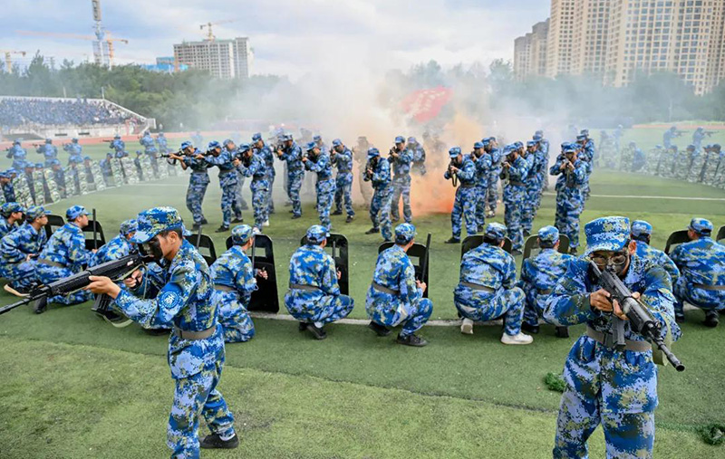 只见红旗方阵的旗手们身姿挺拔,精神抖擞地挥舞着红旗,展现出豪迈的气势与蓬勃的活力。礼宾枪操排列整齐、动作有力。表演匕首操的学员,扎击时精准有力,一招一式迅猛利落,蓬勃的朝气尽显少年风华。棍术表演则棍从肩膀劈下,滑手迅速转向,棍影翻飞疾如风,步伐稳健力千钧,少年意气风发。刺杀操、军体拳、战术演练……典礼现场精彩不断。