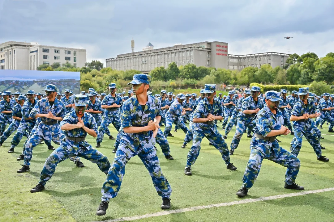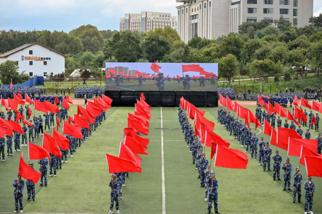 活动在庄严的国歌声中拉开帷幕。分列式开始,党旗、国旗、团旗、校旗引领前进的方向,2024级新生以9个营64个连,7个分列式方阵整齐列队。他们迈着整齐划一的步伐,喊着高昂响亮的口号,自信果敢、英姿勃发,有序通过主席台接受检阅,21天的磨练在此刻交上优异的答卷。