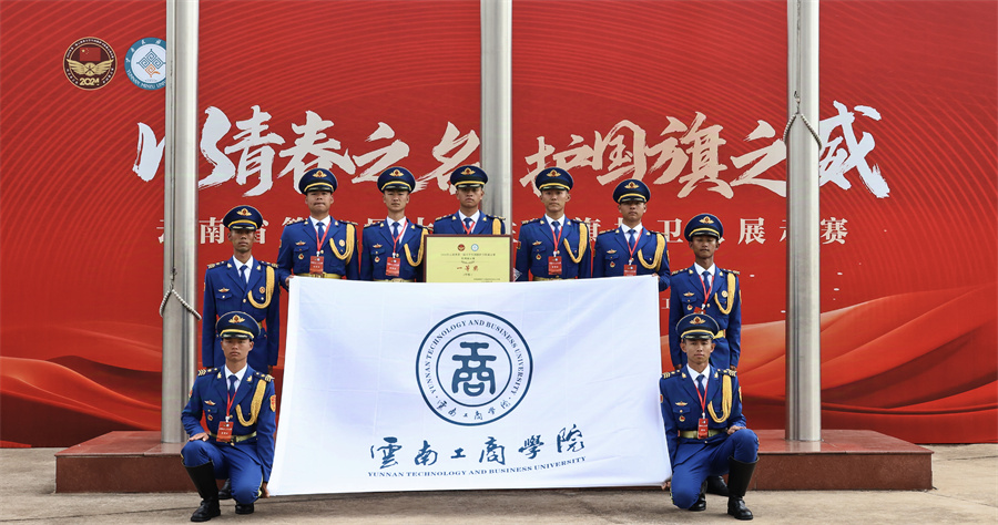 近日,云南工商学院在2024年云南省第一届大学生国旗护卫队展示赛(队列展示赛)决赛中荣获一等奖(本科组)。