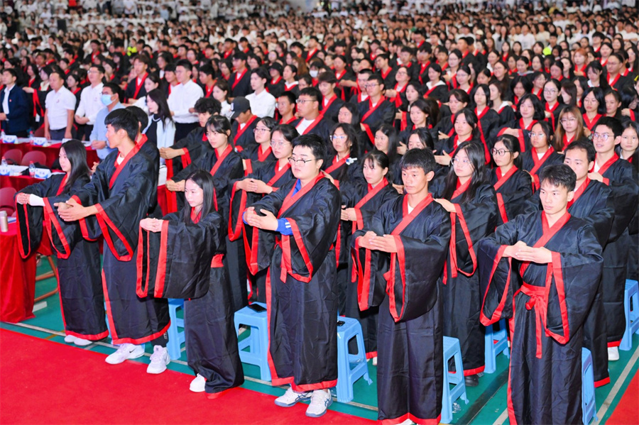 现场,学子们朗诵《工商礼赞》深情表达对母校的爱意和对未来无限的憧憬,古典舞《孔子书简》以其优雅的姿态和深邃的内涵,生动展现了中华文化的博大精深与悠久历史。随后,学校入学尊师礼在融合传统文化与现代教育的仪式中举行,学子们正衣冠,向孔子像敬献花篮,行鞠躬礼,意在表示尊师重道。