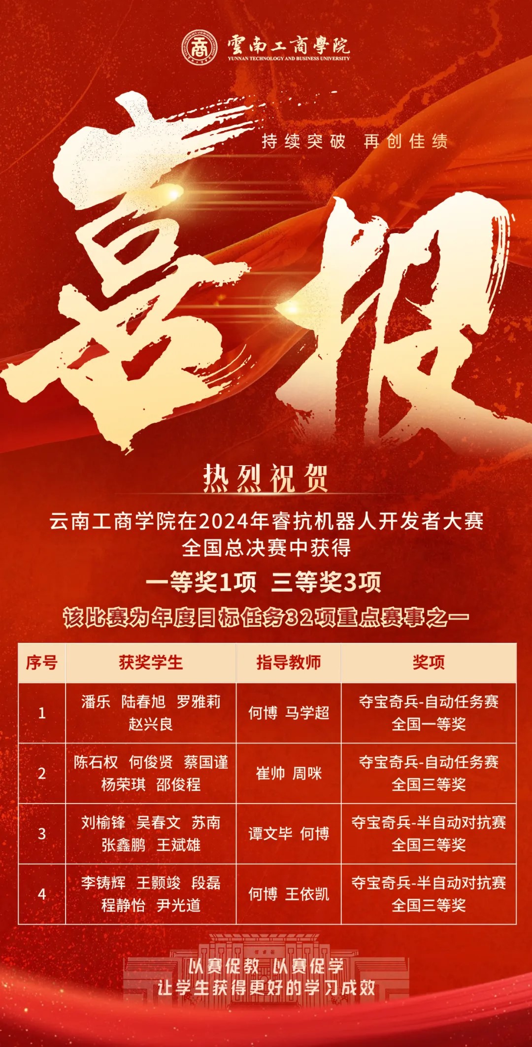 近日,2024睿抗机器人开发者大赛(RAICOM)“夺宝奇兵”全国总决赛圆满落幕,云南工商学院在比赛中斩获佳绩,获得全国一等奖1项,全国三等奖3项的好成绩。