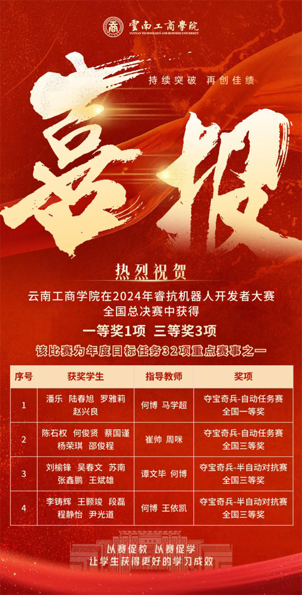 云南工商学院秉持“以赛促学,以赛促教,以赛促创”的理念,高度重视学生的学科专业竞赛工作,积极倡导并广泛鼓励学生参与各类学科竞赛。此次大赛构建了一个产学研用深度融合的平台,为师生提供了更多实践与创新的机会,将机器人技术、人工智能、数字技术等前沿科技融入学校的人才培养体系之中,实现了赛教融合的深度实践,为学生创造了更加广阔的发展空间和成长机遇。