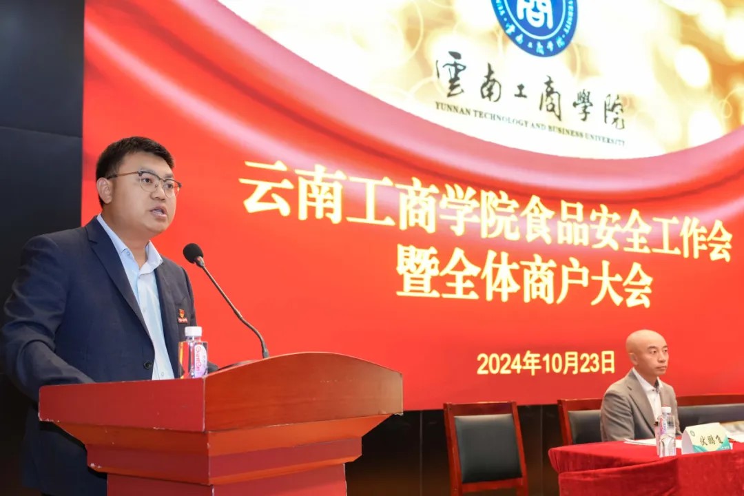 为坚决贯彻落实习近平总书记关于食品安全“四个最严”要求,进一步抓好校园食品安全工作,强化校园食品安全责任意识,落实学校食品安全主体责任,确保校园食品安全。10月23日,云南工商学院召开食品安全工作会暨全体商户大会,学校执行董事长姬其佐,党委书记李国琼,校长蒋永文,监察审计处处长陈文琴出席会议,学校资产经营处全体成员、全校食堂负责人、签约商户负责人、食品安全员等参加会议。会议由校长助理伏鹏飞主持。