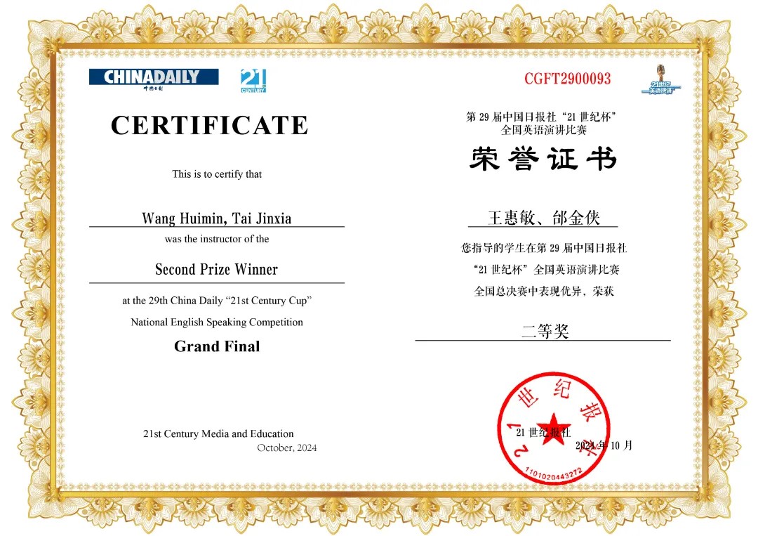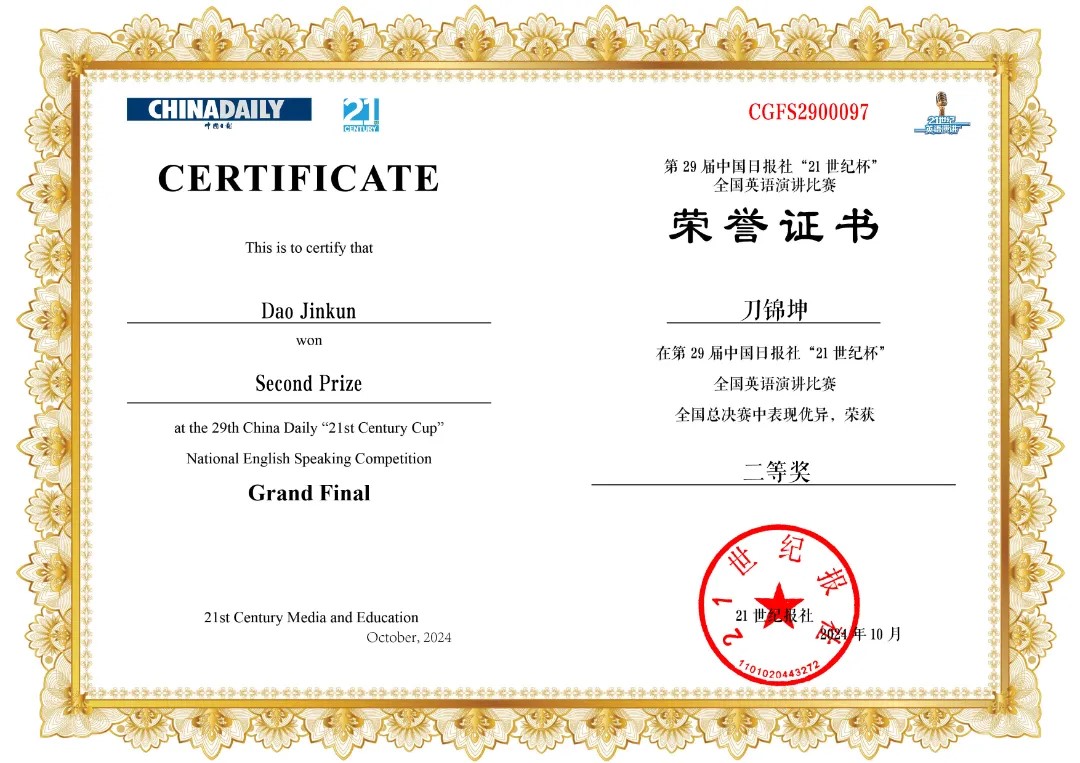 本届赛事自2024年1月开启,于10月圆满收官,刀锦坤、张勇两位同学一路过关斩将,从校赛晋级省赛,再到国赛摘得荣誉。这份荣誉既是对参赛同学、指导老师的认可,也是对学校教育教学成果的肯定。下一步,学校将以此为契机,持续推进“以赛促教”,搭建多层次中外语言课程体系和外语实践平台,潜移默化的提升学生的语言能力、跨文化沟通能力及国际化素养,培养“强语言、精专业、通规则、能跨界”的国际化创新型人才。