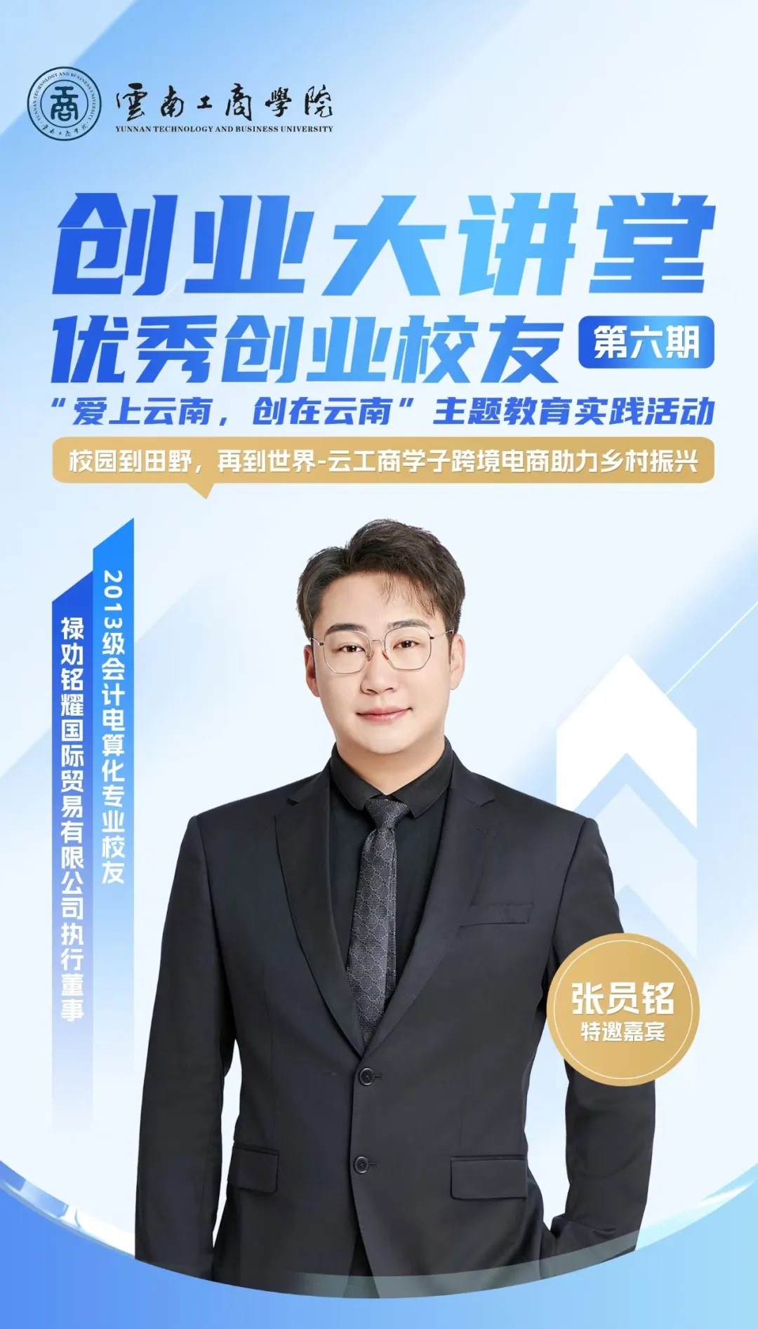 张员铭,2013级会计电算化专业毕业生,在大学期间开始自主创业,现任禄劝县农民对外贸易协会会长,禄劝铭耀国际贸易有限公司执行董事。作为“铭耀国际全球购”公众号、“悦己全球购”跨境电商商城创始人,目前所创办公司已与中国南光集团、广东省农垦集团达成跨境电商合作, 通过跨境贸易帮助当地农户实现年销售额达400多万元,对禄劝县乡村振兴做出了重大的贡献,2024年被县政府评为“优秀青年企业家”。