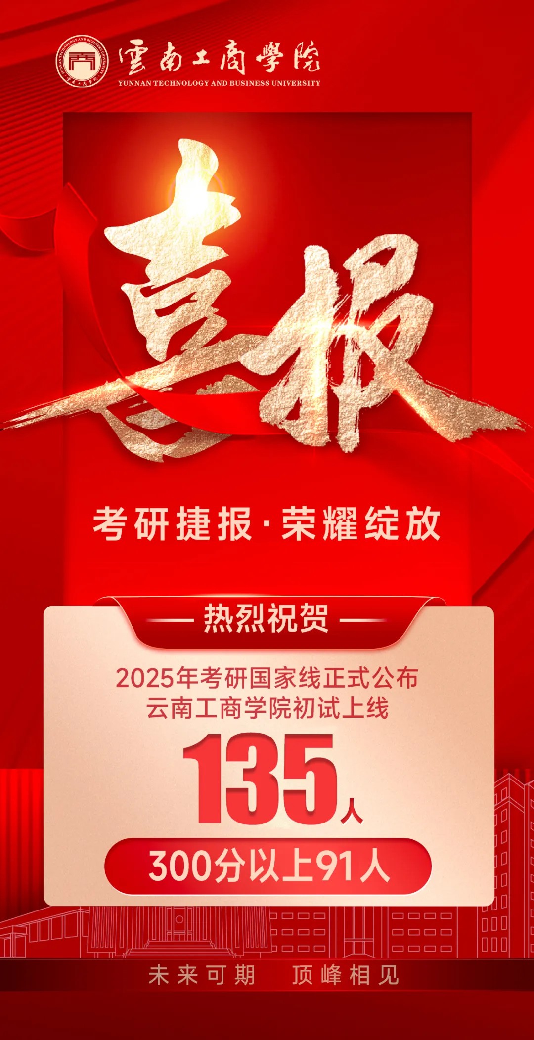 天道酬勤,功不唐捐!2025年全国硕士研究生招生考试国家分数线正式公布,云南工商学院再创佳绩,初试上线人数达135人,再创我校考研初试新高!