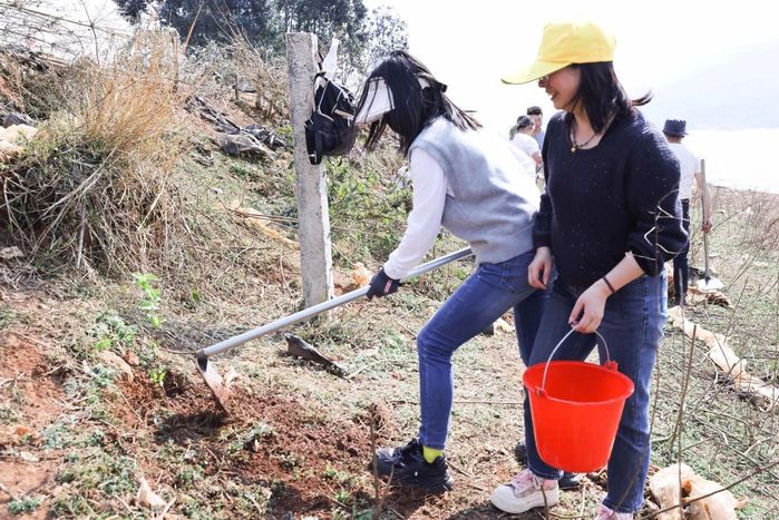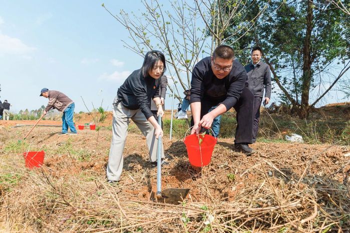活动当天正值我国第47个植树节。现场参与人员分组协作,挥锹铲土、扶苗填坑、提水浇灌,在上游水库沿岸种下樱花树苗。这些树苗未来会形成生态景观带。
